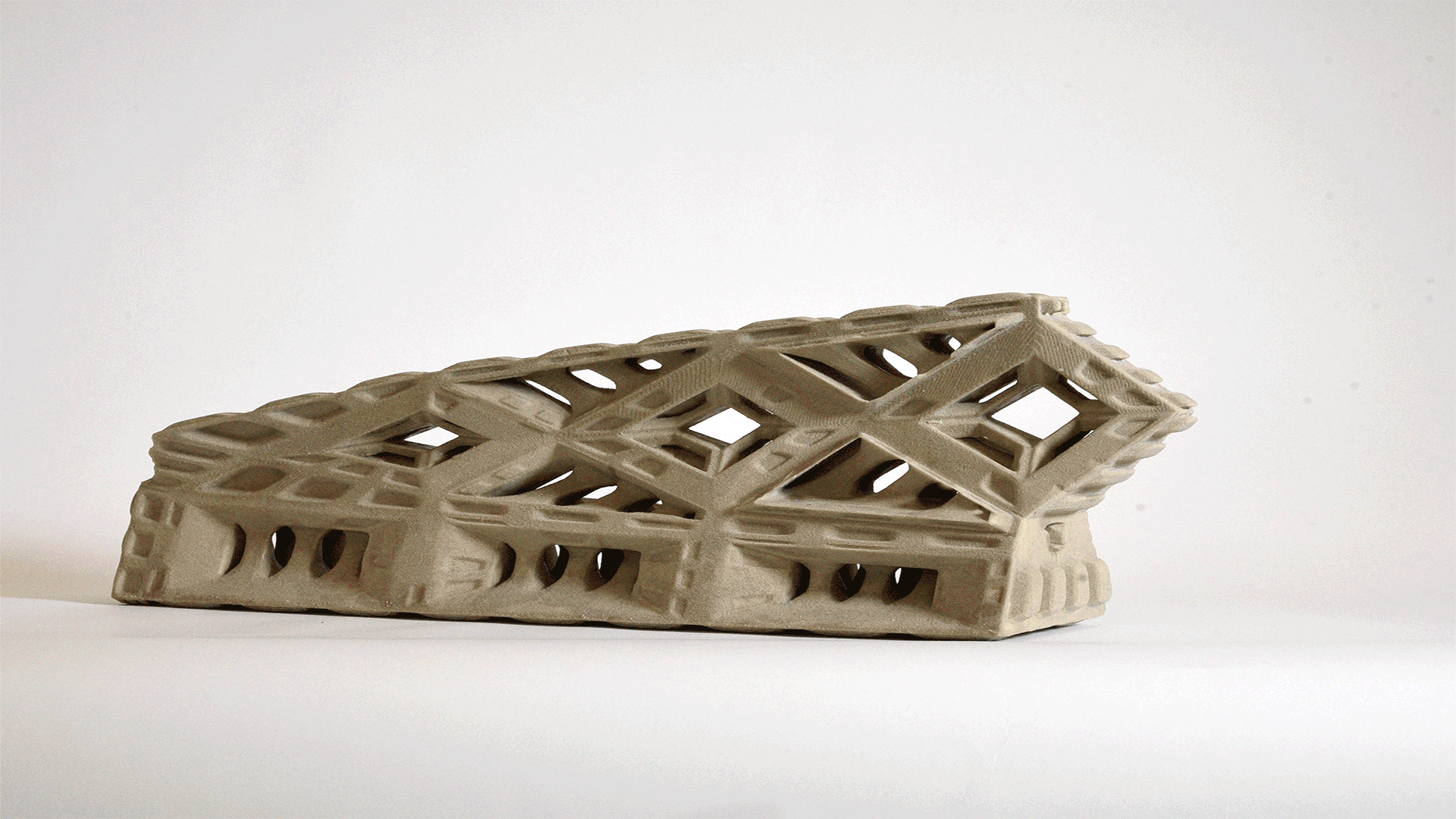 Because sandstone printed elements can only take compression forces, the structural system is designed so that, after pre-stressing, the printed elements become compression-only. The structural evaluation regards the beam as one structural element, with no degrees of freedom between its components. Through several design iterations joints that interlock the components have been developed, making the beam one structural element.