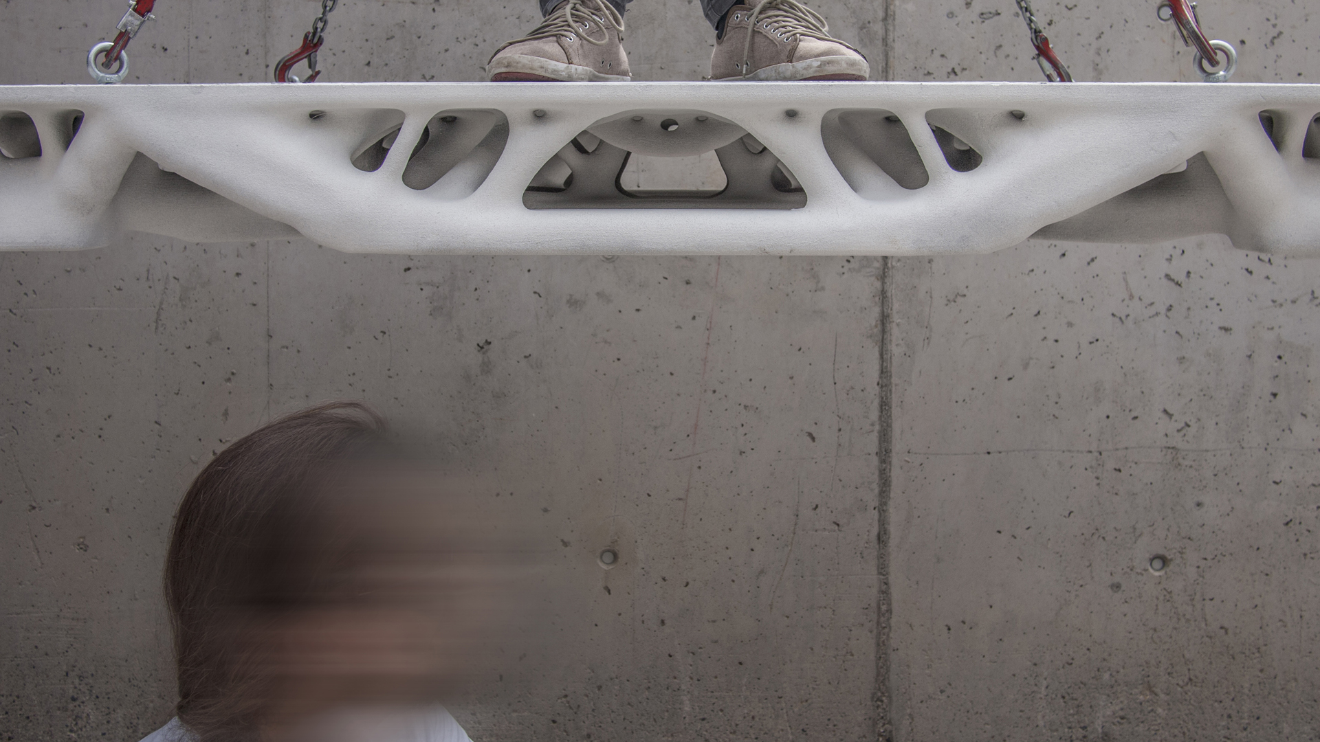 The resulting design was fabricated using a nine millimetre thin 3D printed formwork, stabilised with a synthetic surface infiltration agent. Due to the optimised topology, the resulting concrete slab, weighing ~120 Kg, is 70 % lighter than a standard concrete solid slab covering the same area.